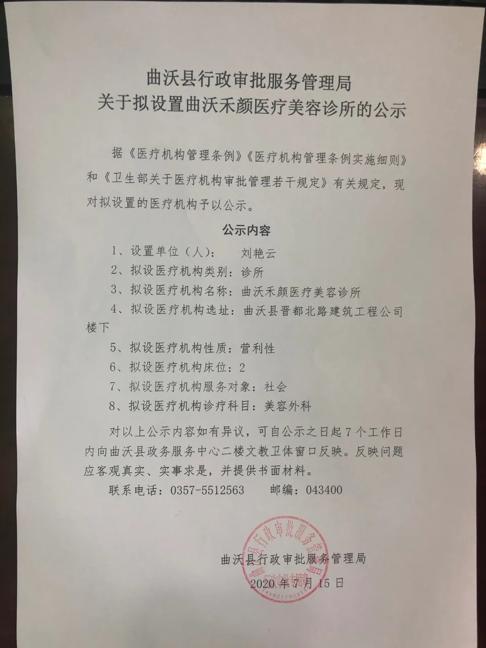3、擬設(shè)醫(yī)療機構(gòu)名稱:曲沃禾顏醫(yī)療美容診所