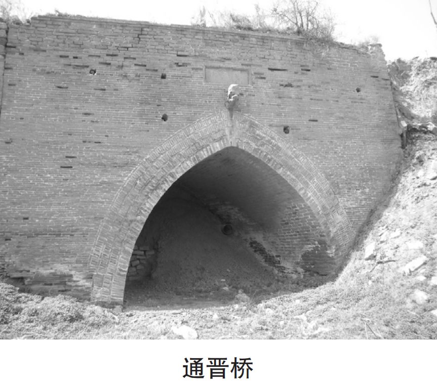 南屬寺村西二里處有座單拱磚石橋,橋呈東西走向,橫跨在兩丈多深的臥龍溝上。橋東西總長(zhǎng)約十余丈,南北寬約一丈八尺,橋底是條石基座,上為磚砌拱券,橋拱高約一丈五尺,寬約一丈二尺,拱券至橋面高約五尺。南側(cè)橋拱上方中央鑲有一塊青石匾額,上書(shū)“通晉橋”三個(gè)大字,北側(cè)也有一青石匾額,上書(shū)“臥龍溝”三個(gè)大字。 匾額上方正中央有一石雕龍頭,龍口巨張,連通橋面、為橋頂排水出口。據(jù)村民傳說(shuō),橋拱下過(guò)去曾懸一青銅寶劍,為鎮(zhèn)妖所用。