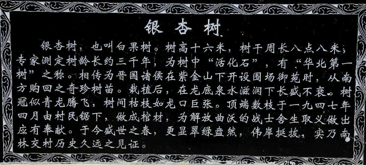 樹齡千年以上,樹圍8.8米,高38米,有植物園(活化石)之稱。南林交村中老人們夸它是宇宙間的精華,傳說(shuō)為周秦遺物,百姓奉若神明。