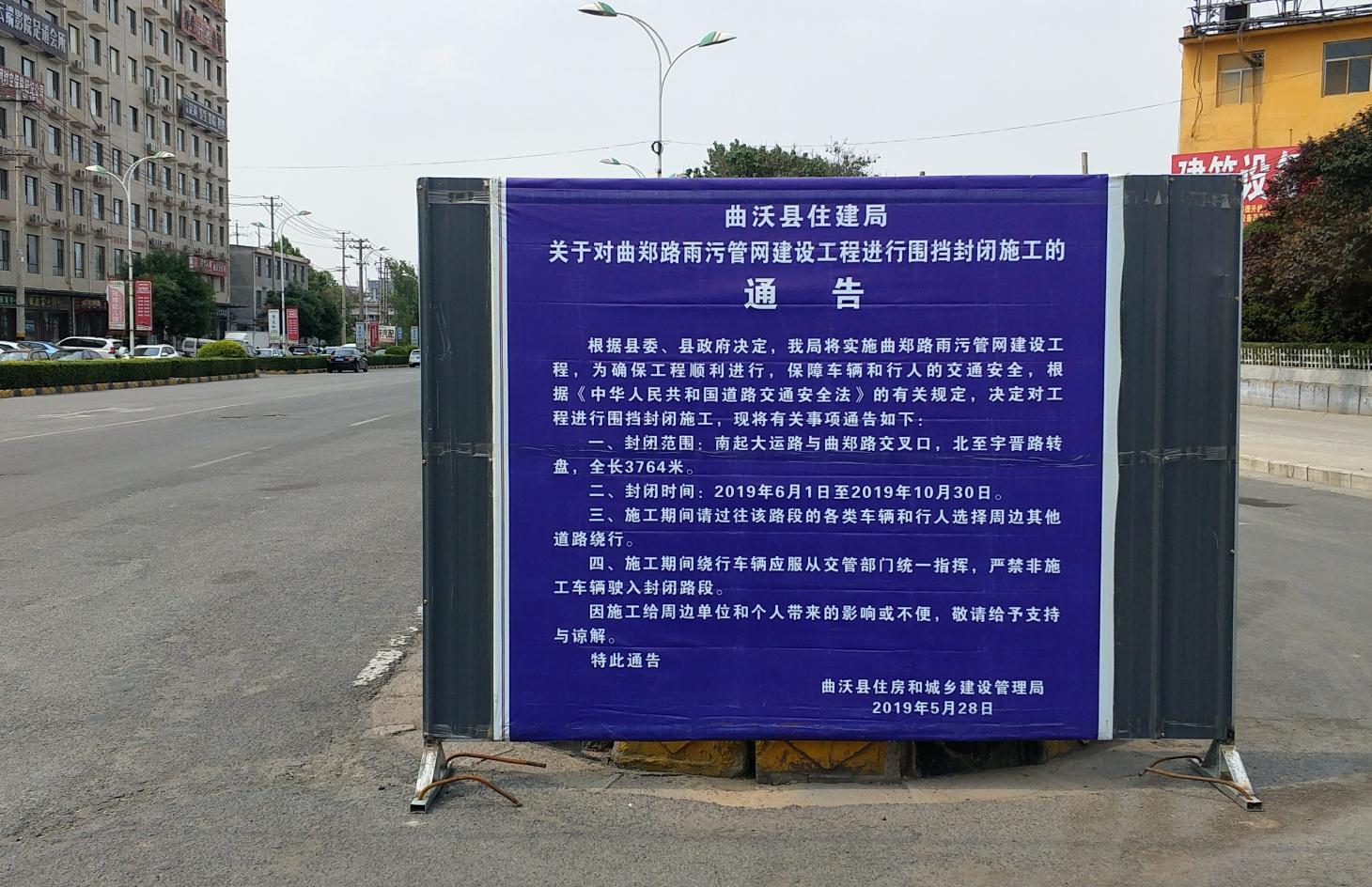 根據(jù)縣委、縣政府決定,我局將實施曲鄭路雨污管網(wǎng)建設(shè)工程,為確保工程順利進(jìn)行,保障車輛和行人的交通安全,根據(jù)《中華人民共和國道路交通安全法》的有關(guān)規(guī)定,決定對工程進(jìn)行圍擋封閉施工,現(xiàn)將有關(guān)事項通告如下: