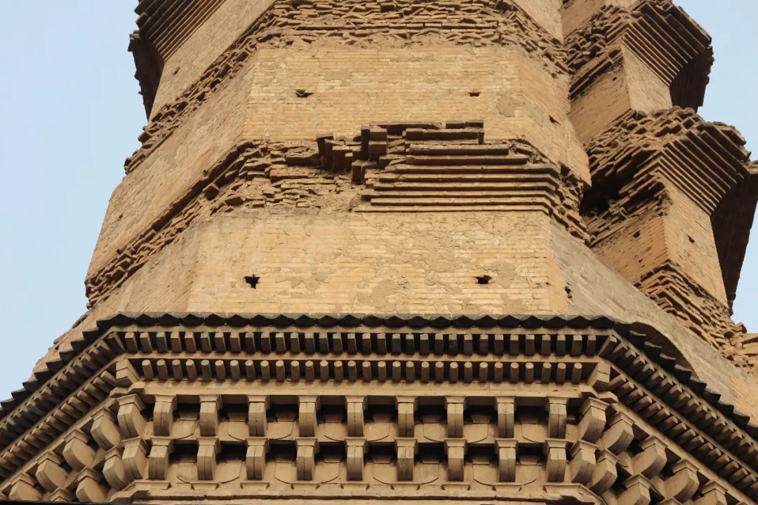 塔身一層以上的密檐部分隨高度將每一層出檐深度都往里做不等量的遞減,使塔的外形顯得更加高挺、碩壯。