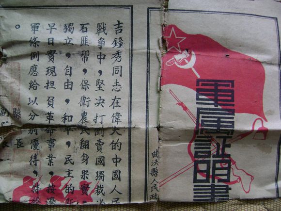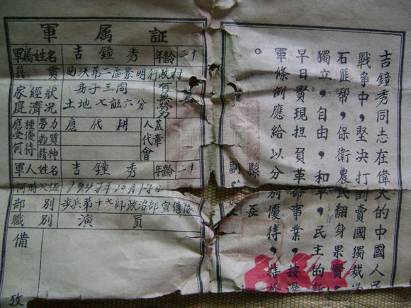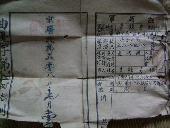 70年前的軍屬證明證(曲沃)