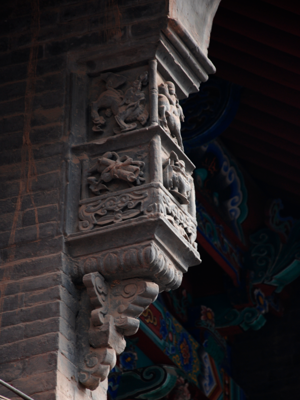 薛家大院,呈南北中軸線布局,從南向北有前院、中院、北院,山門位于前院東南角,現(xiàn)存建筑沿中軸線依次有:南房、過廳、過廳樓、北樓。前院均為平房,由山門、東西廂房、南房、過廳組成;中院經(jīng)過廳樓與后院相連,由東西樓、北樓組成。東西樓形制相同,面闊三間,建筑面積為91.8平方米。北樓為明三暗五的建筑格局。北、中院系兩層閣樓式磚木結(jié)構(gòu),南院為一層磚木結(jié)構(gòu),整個(gè)大院錯(cuò)落有致、古樸典雅,具有晉文化風(fēng)格。大院建筑中保存有精美的石雕、木雕及彩繪,北樓下欄額木雕技藝精湛,樓內(nèi)雕梁畫棟裝飾華麗,前檐柱下柱礎(chǔ)石雕刻精美,具有典型的清代地方建筑風(fēng)格。